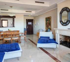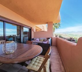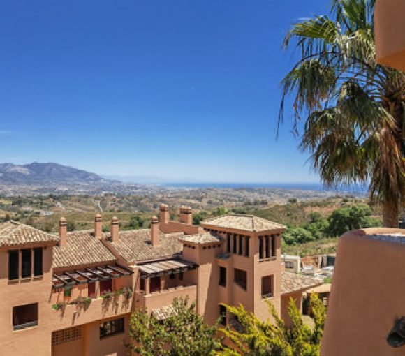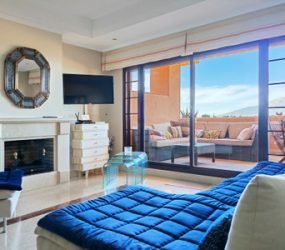 Apartment for sale in El Soto de Marbella, Marbella with 2 bedrooms, 2 bathrooms and with orientation east, with communal swimming pool, private garage (1 parking spaces) and communal garden. Regarding property dimensions, it has 192 m² built, 122 m² interior and 25 m² terrace. Has the following facilities mountainside, air conditioning, fully furnished, fully fitted kitchen, utility room, fireplace, marble floors, satellite tv, guest room, dining room, private terrace, kitchen equipped, living room, sea view, mountain view, laundry room, electric blinds, fitted wardrobes, gated community, lift, panoramic view, close to sea / beach, close to golf, handicap accessible, excellent condition, close to shops, close to town, close to schools, surveillance cameras and pets allowed.