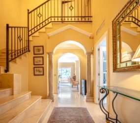 Walking through the heavy wooden armored front door you are enveloped in the sunlight that streams in through the terrace windows in the living room. The vaulted hall itself is imposing with the ornate staircase curving upwards to the first floor and the regal pillars on either side of hallway, framing the view ahead.