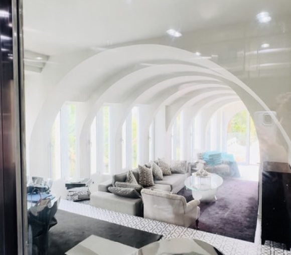 Spread over 4 levels, all connected via a state-of-the-art glass elevator, this home offers generous spaces and an optimized layout. The open-plan concept includes an entrance hall, a living room with a vaulted ceiling and an open fireplace, an elegant dining area, and a modern, fully-equipped Gaggenau kitchen with sleek black granite countertops.