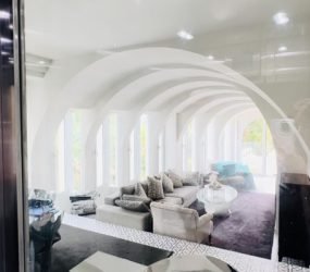 Taking the elevator down to the main floor, you’ll find the fabulous master bedroom, featuring an oversized king-size bed and a round open bathtub overlooking the pool and garden. The luxurious decor, elegant lighting, high-quality furnishings, and exquisite silk curtains give this space a touch of opulence.