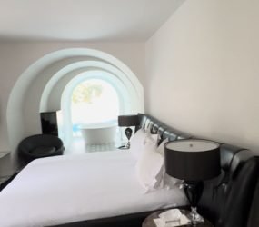 To the left of the elevator, you enter the second bedroom (BR2), designed in a unique layout featuring an elegant king-size bed, a separate shower and toilet, and an adjacent sink area, all adorned with beautiful silk curtains.