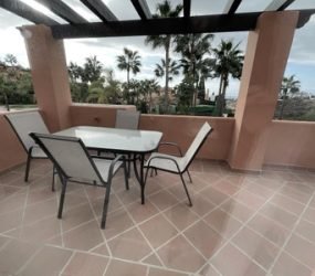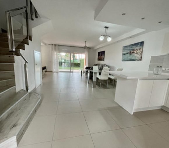 New south facing three bedroom townhouse in Paraiso Bellevue, in El Paraiso on the New Golden Mile, just a short drive from the beach and all leisure amenities. The complex boasts fantastically maintained gardens and a large communal lagoon style swimming pool. On the main level there is a living room with a fireplace and patio doors leading to the terrace and private garden; Open plan kitchen along with breakfast bar and guest toilet. On the upper level is the master suite with access to the private terrace and two guest bedrooms that share a bathroom. There is also a large solarium with partial sea and mountain views. Other features include marble floors, fitted wardrobes and hot and cold air conditioning.